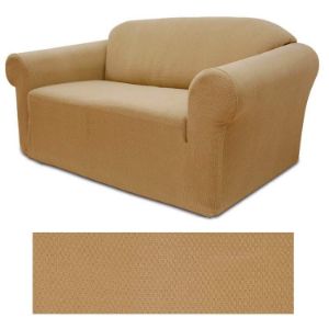 Stretch Pique Gold Nugget fabric is designed to fit snugly and securely even on the most difficult furniture. Memory stretch cover in waffle textured fabric will stretch up to 30% and contours to your furniture like a glove. This slipcover adds class and style to any room instantly. Wrinkle free and machine washable, do not iron. 95% polyester, 5% spandex.